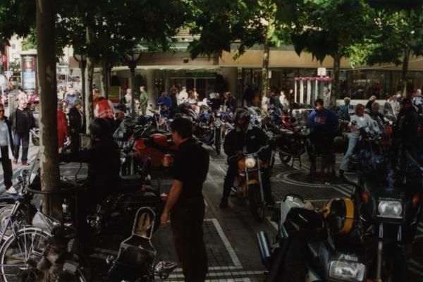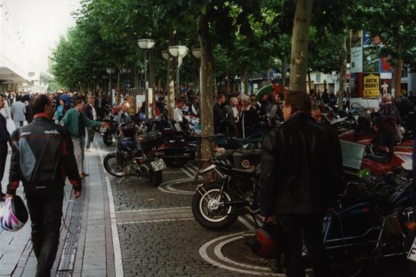 Parkplatz, wo viele Sonntagsspaziergänger die Maschinen aller Fabrikate,