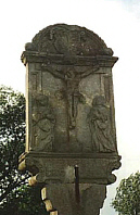 besitzt einen viereckigen Oberbau auf dem ein Kruzifix, Maria und Johannes