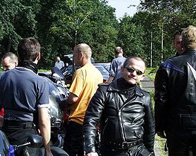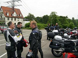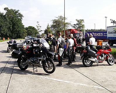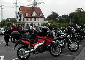 fünfzehn Bikerlein und ein Sozius, um sich auf den Weg in den schönen