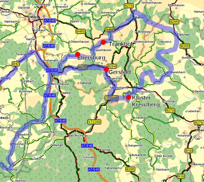 dann über Bad Orb, Burgjoß, Marjoß, Sinntal und Kalbach zur