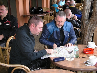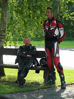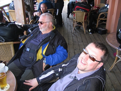 angesagt, Klaus und Christian warten vor der Abfahrt im Halbschatten.