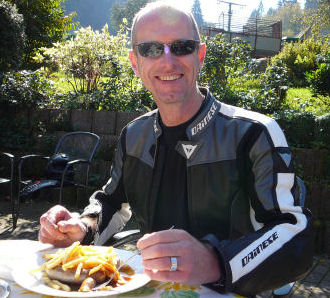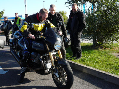 Noch bevor es losgeht sitzt Andi Probe auf Ralfs neuer Guzzi.