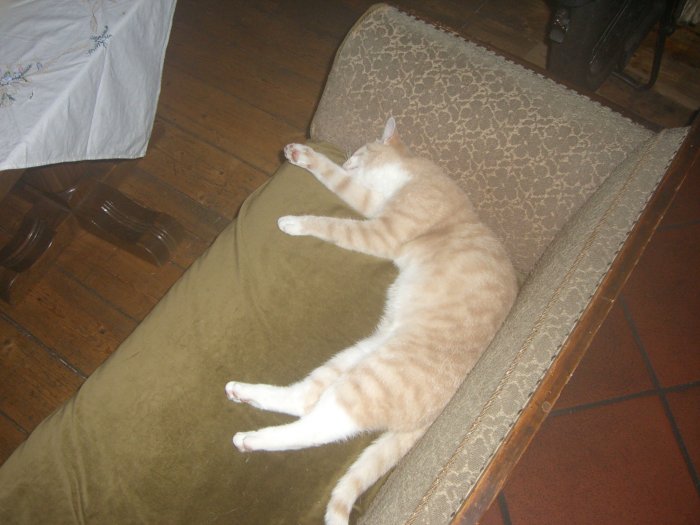 Kamin, Pussy auf dem Sofa, Motorräder an der Wand und greifbar als Deko