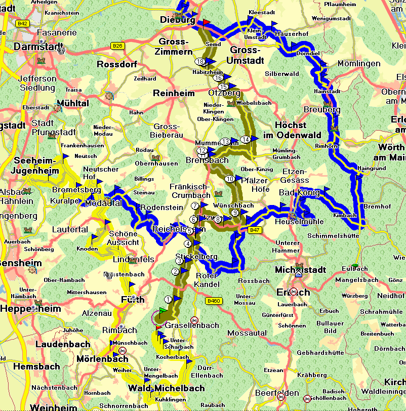 und danach weiter südlich über Fürth nach Mörlenbach.