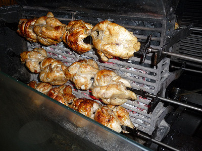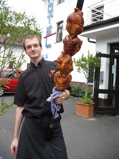 kam aufgereiht an riesigen Spießen vom Holzkohlegrill auf die Teller.