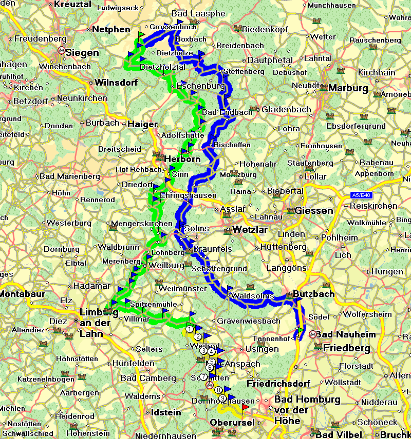 durch das Dietzhölztal, Siegbach, Sinn, Weilburg, vorbei an Runkel zum
