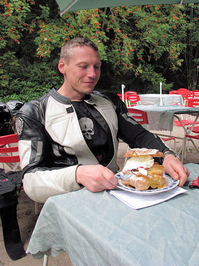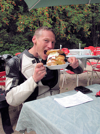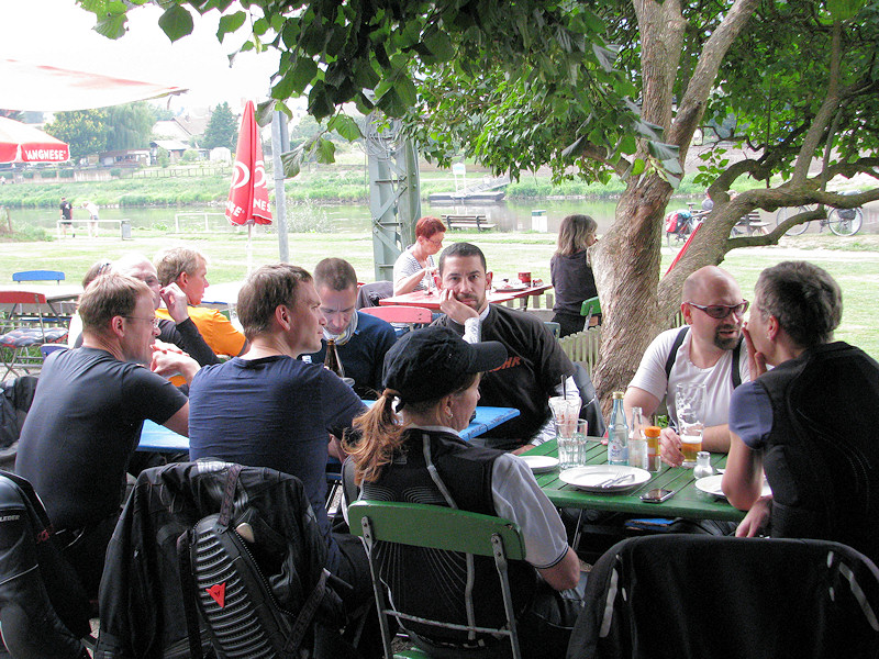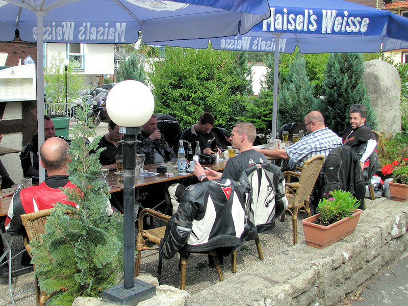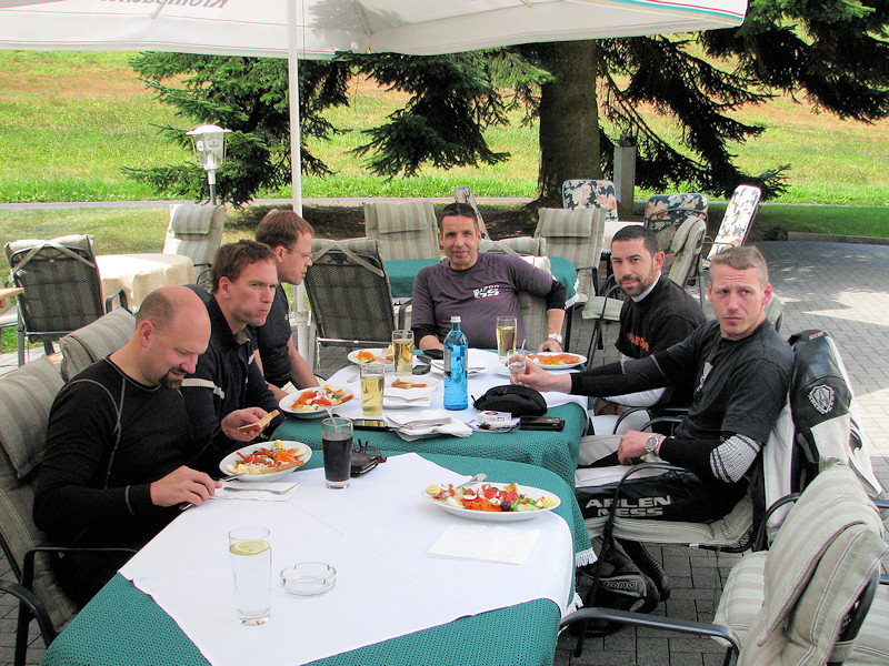 | BEim 'Mittagessen am Freitag, die mittlere Gruppe mit Tourguid Marc. Wir sehen hier vlnr: Jochen, Thomas, Peter, Hagen , Marc und Tom, den Tourguid der flotten Gruppe. |