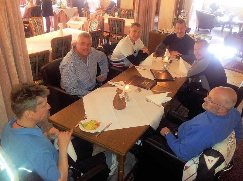 | >Eine kleine Pause auf der Tour machen Armin, Manni, Gerhard, Eric und Jens |