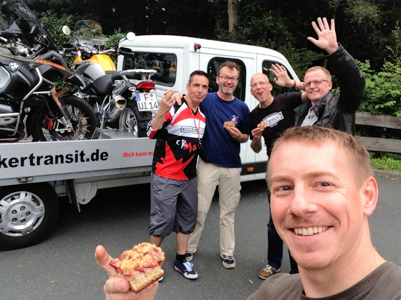 | Kurz vor Anreise aus Deutschland mit Bikertransit. Hagen, Stefan, Tobias, Olaf und Jens nach dem Verladen in Oberursel mit dem verdienten Stück Kuchen. |
