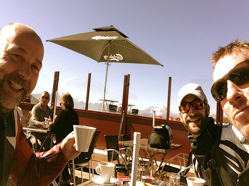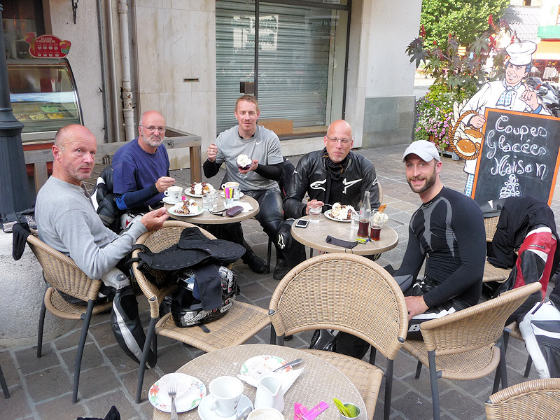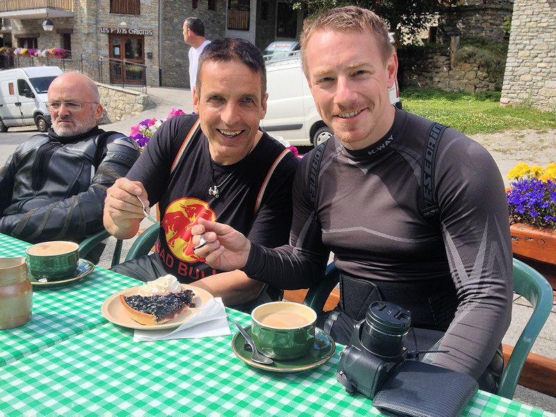 | Kaffee und Kuchen nach dem Abstieg vom Col de l’Iseran v.l.n.r.: Manni, Hagen, Jens, |