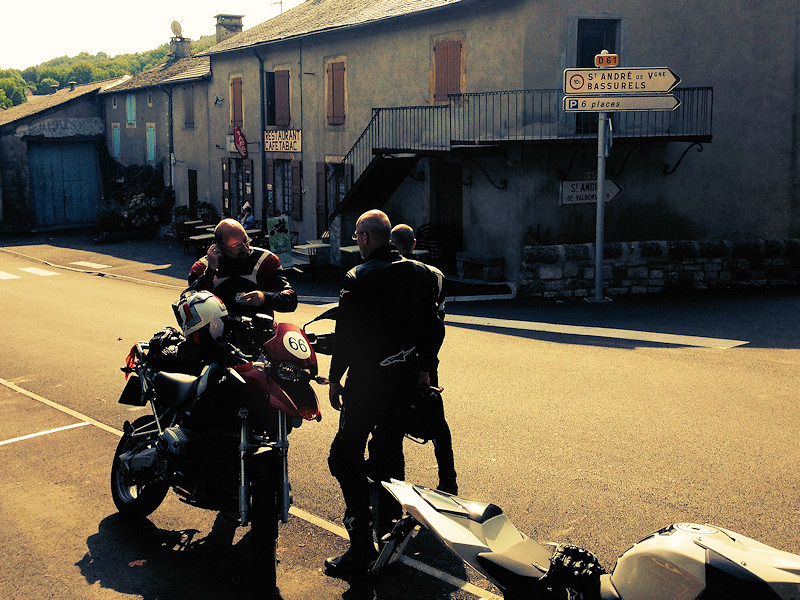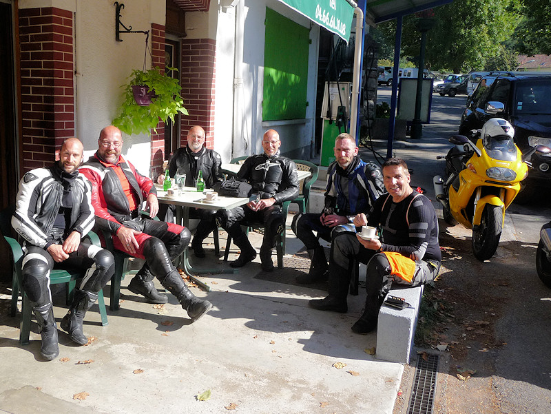| Am folgenden Tag Kombination aus Tour 7 und 9. Kaffeepause in Villefort v.l.n.r.: Lutz, Andi, Manni, Tobias, Andreas, Hagen, . |