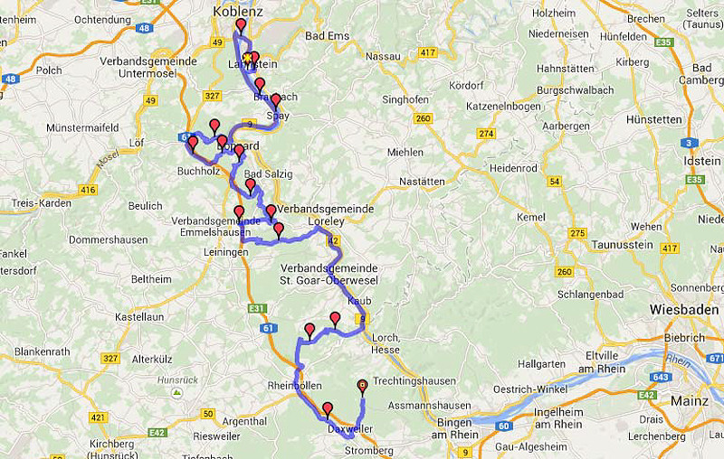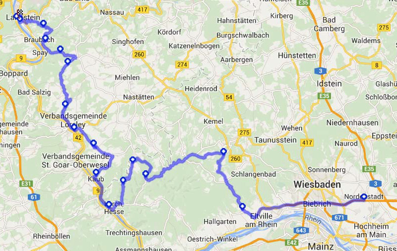 | Zum Abschluss mit der Fähre von Bingen nach Rüdesheim und über die B42/A66 zurück nach Frankfurt! |