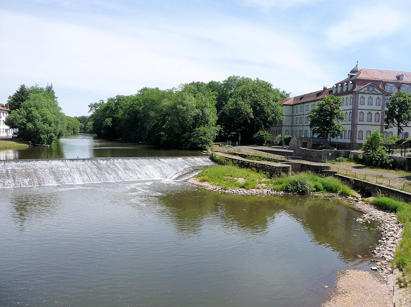Die Fulda mit Wehr und die hessische Landesfinanzschule (rechts).